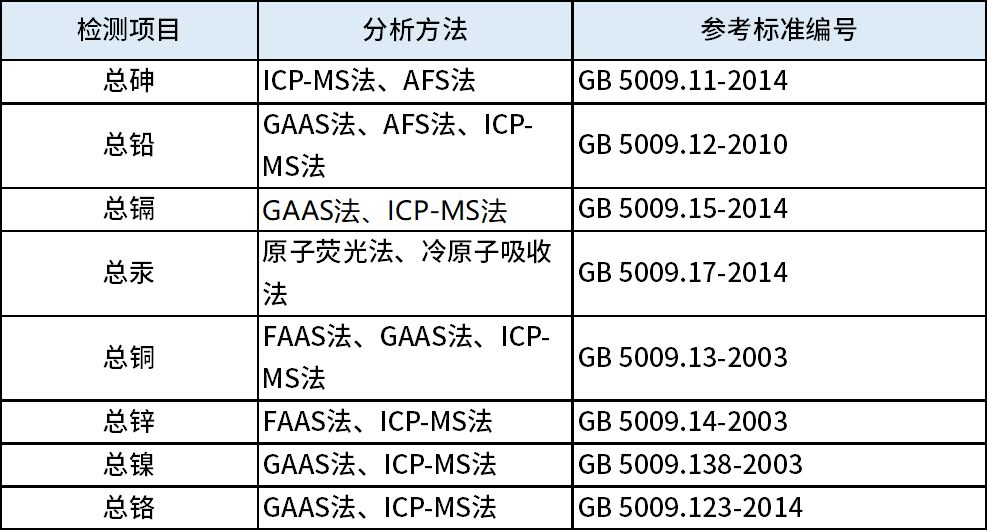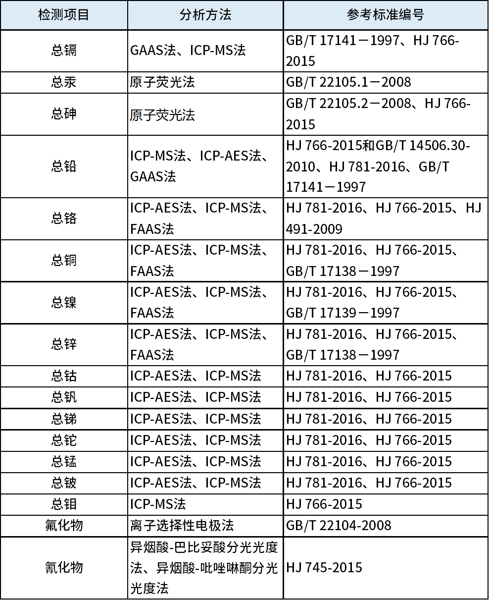 檢測方法說明:ICP-MS 等離子體質譜、ICP-AES 等離子體發射光譜、GAAS石墨爐原子吸收、FAAS火焰原子吸收、 AFS 原子熒光、GC-FID 氣相色譜火焰光度、GC-MSD氣相色譜質譜、HRGC-HRMS 高分辨氣相色譜高分辨質譜