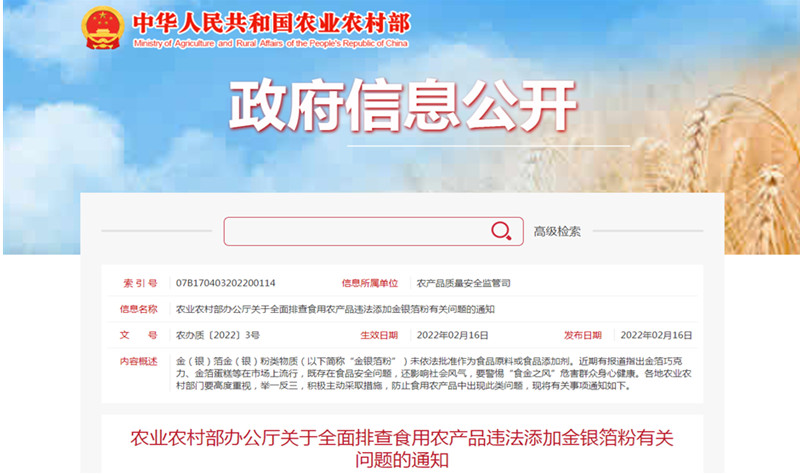 農業農村部:全面排查食用農產品違法添加金銀箔粉有關問題