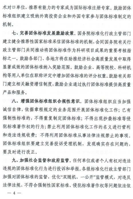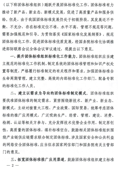為貫徹落實《國家標準化發展綱要》,規范團體標準化工作,促進團體標準優質發展,經國務院標準化協調推進部際聯席會議全體會議審議通過,國家標準化管理委員會等十七部門聯合印發了《關于促進團體標準規范優質發展的意見》。
