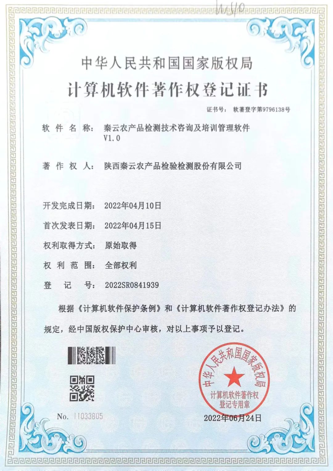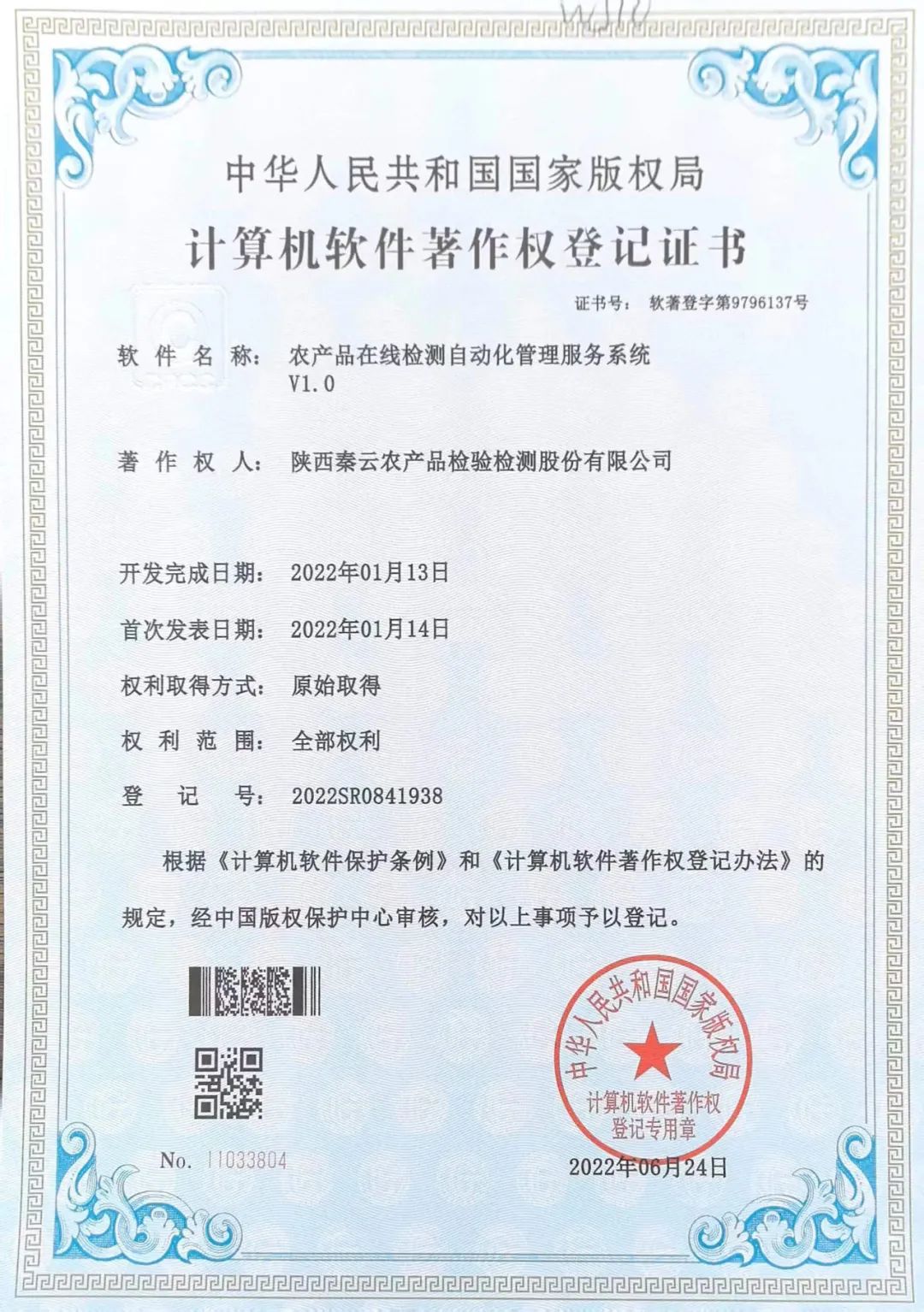 喜訊!陜西秦云農檢成功獲得三項計算機軟件著作權登記證書