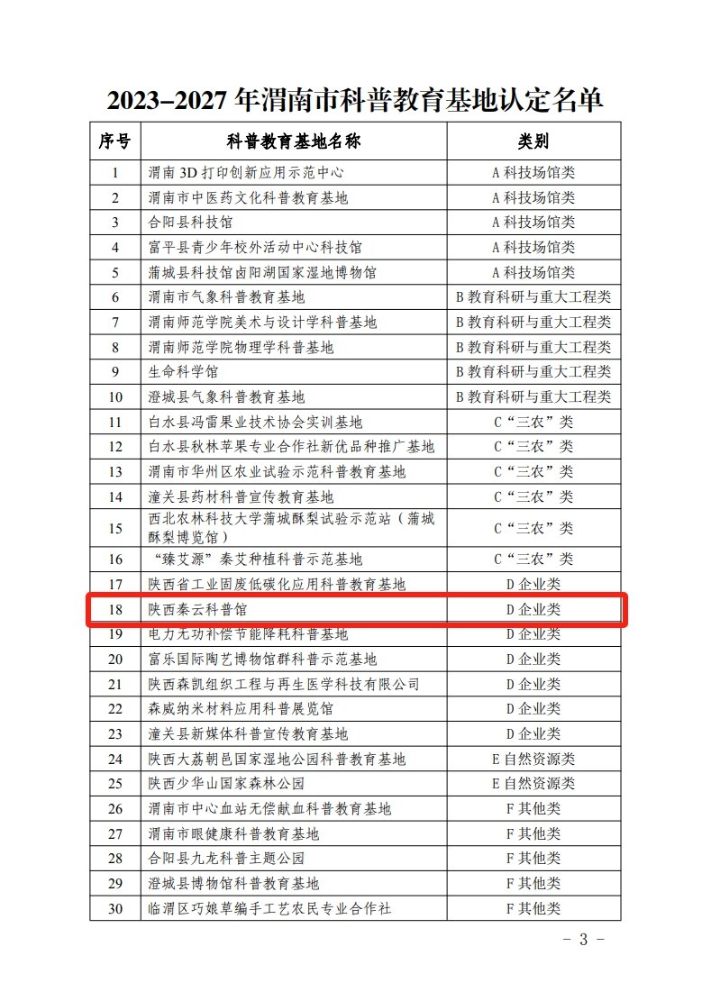 近日,渭南市科學(xué)技術(shù)協(xié)會(huì)、渭南市科學(xué)技術(shù)局發(fā)布《關(guān)于認(rèn)定“2023-2027年渭南市科普教育基地”的通知》,陜西秦云農(nóng)產(chǎn)品檢驗(yàn)檢測(cè)股份有限公司申報(bào)的陜西秦云科普館獲批企業(yè)類“渭南市科普教育基地”。