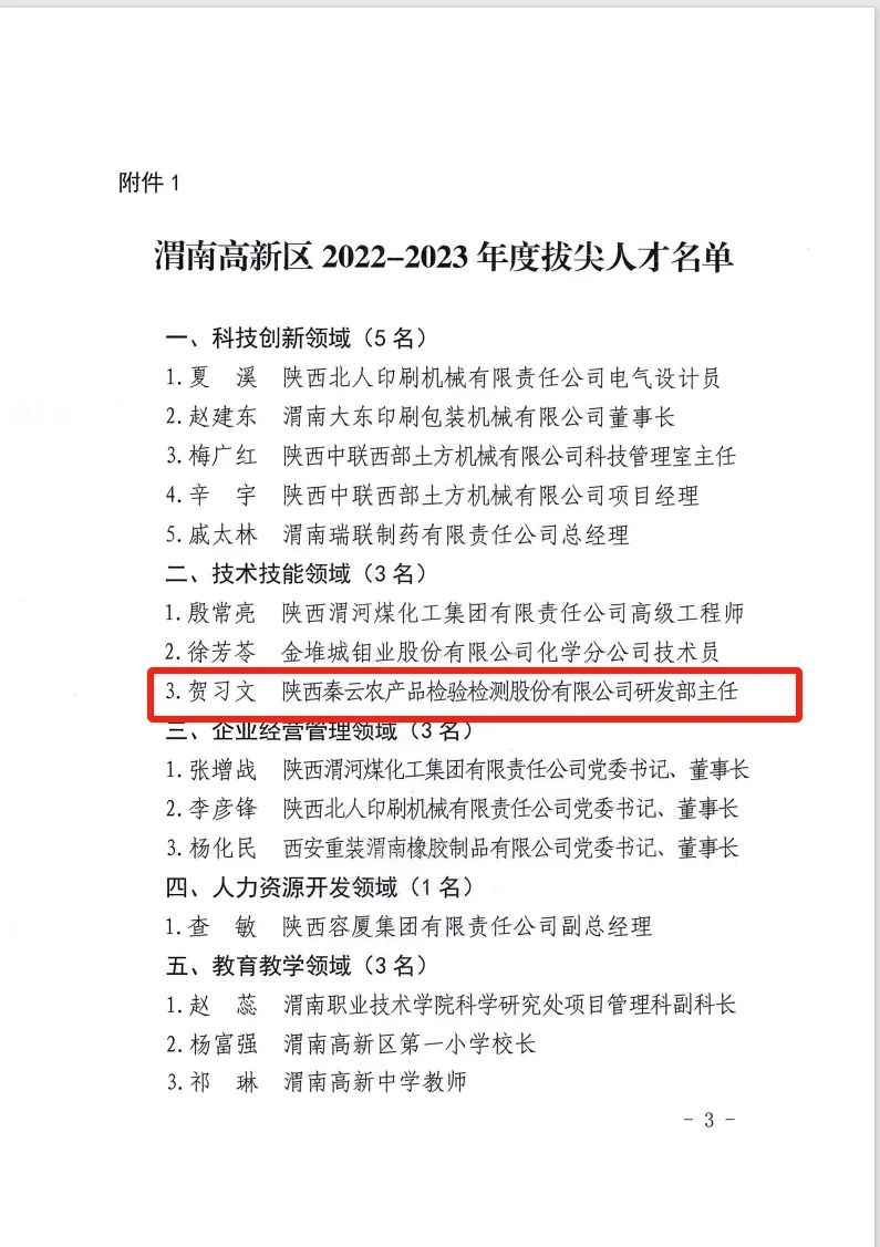 陜西秦云農檢員工喜獲“渭南高新區2022—2023年度拔尖人才”榮譽稱號