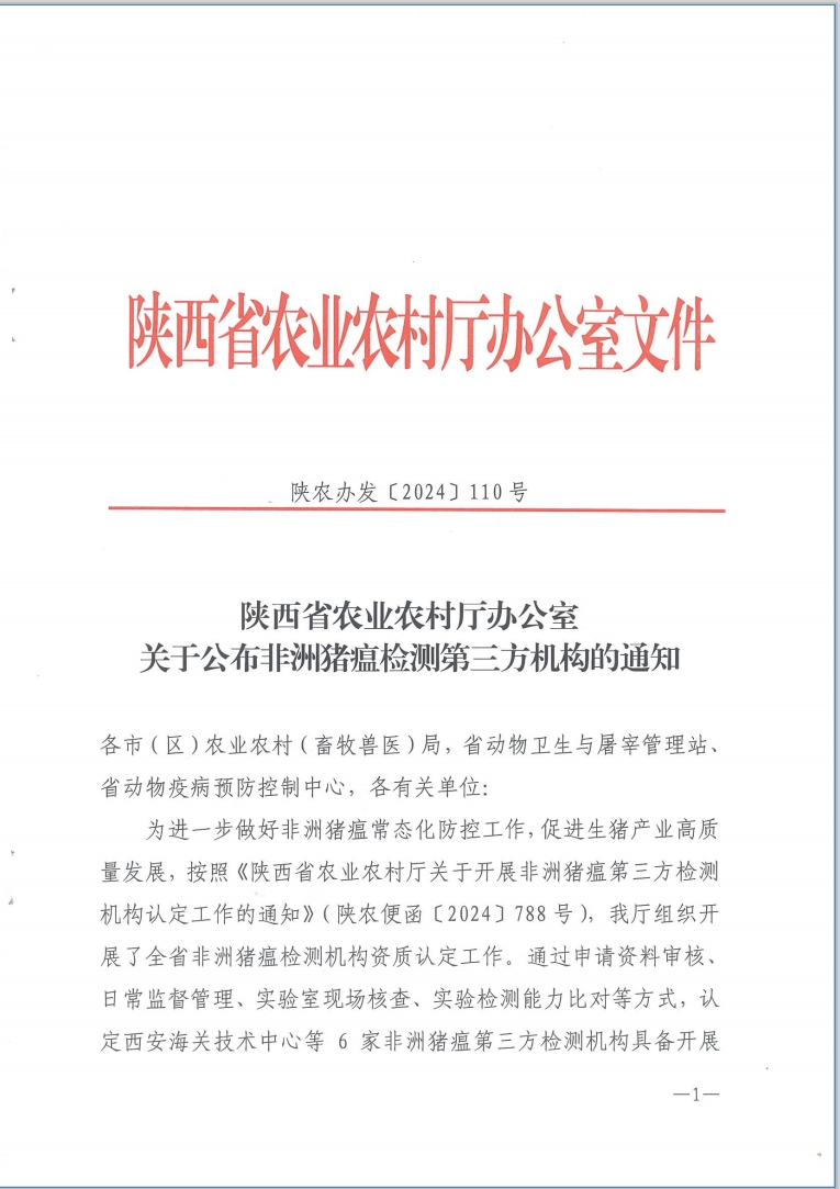 為進一步做好非洲豬瘟常態化防控工作,促進生豬產業高質量發展,按照《陜西省農業農村廳關于開展非洲豬瘟第三方檢測機構認定工作的通知》(陜農便函〔2024〕788號),省農業農村廳組織開展了全省非洲豬瘟檢測機構資質認定工作。通過申請資料審核、日常監督管理、實驗室現場核查、實驗檢測能力比對等方式,認定陜西秦云農產品檢驗檢測股份有限公司等非洲豬瘟第三方檢測機構具備開展非洲豬瘟檢測的能力。