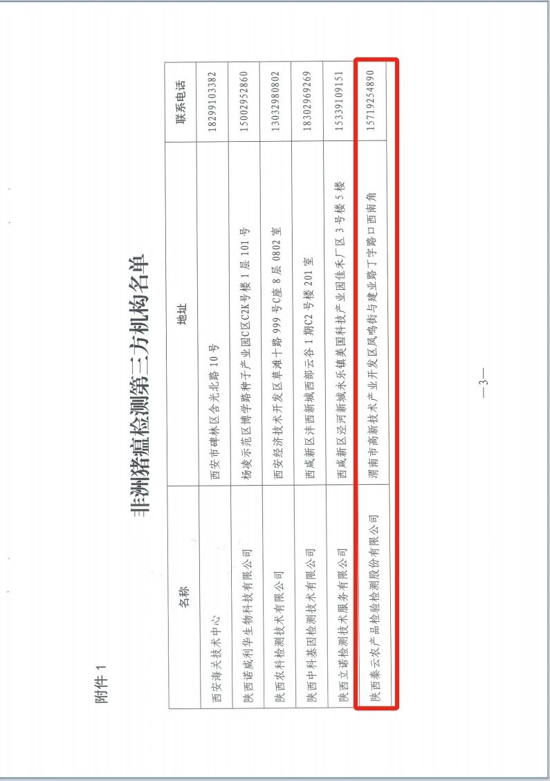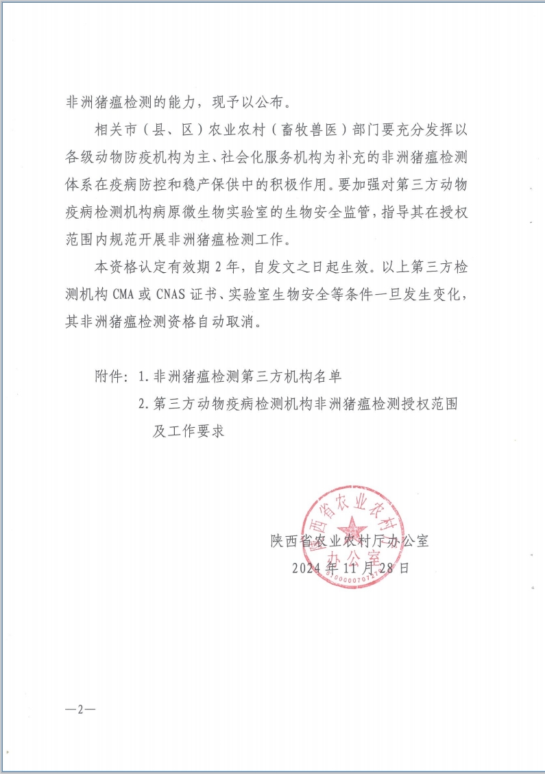 11月28日,陜西省農業農村廳辦公室印發《關于公布非洲豬瘟檢測第三方機構的通知》,陜西秦云農產品檢驗檢測股份有限公司成功通過陜西省非洲豬瘟社會第三方檢測機構認定。